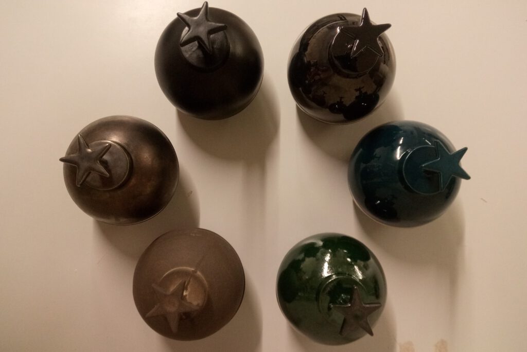 De schaal met deksel vormen samen een bom, wat zeer herkenbaar is als vorm en als wapen.
